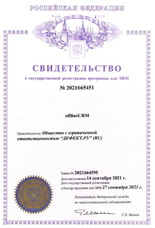 OffineCRM Source Code is registered by Federal Service for Intellectual Property(commonly known as Rospatent). Our juridical person is in hold of respective certificate. The next goal is to receive a Ministry of Communications Software Registry certification — a well-deserved merit that would confirm CRM’s quality.